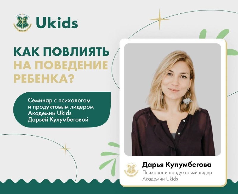 Дарья Кулумбегова — психолог, специалист по детско-родительским отношениям, сооснователь и автор программы академии Ukids. Мама двоих сыновей. Её методики уже помогли 30 000 детей раскрыть свой потенциал, а их родителям — построить доверительные и гармоничные отношения